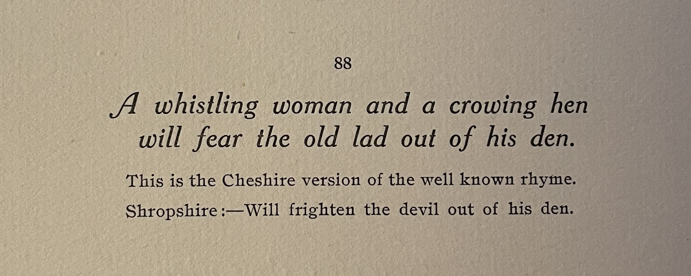 4201 topical index results for A whistling women and a crowing hen. The rhyme has at least three common variants.